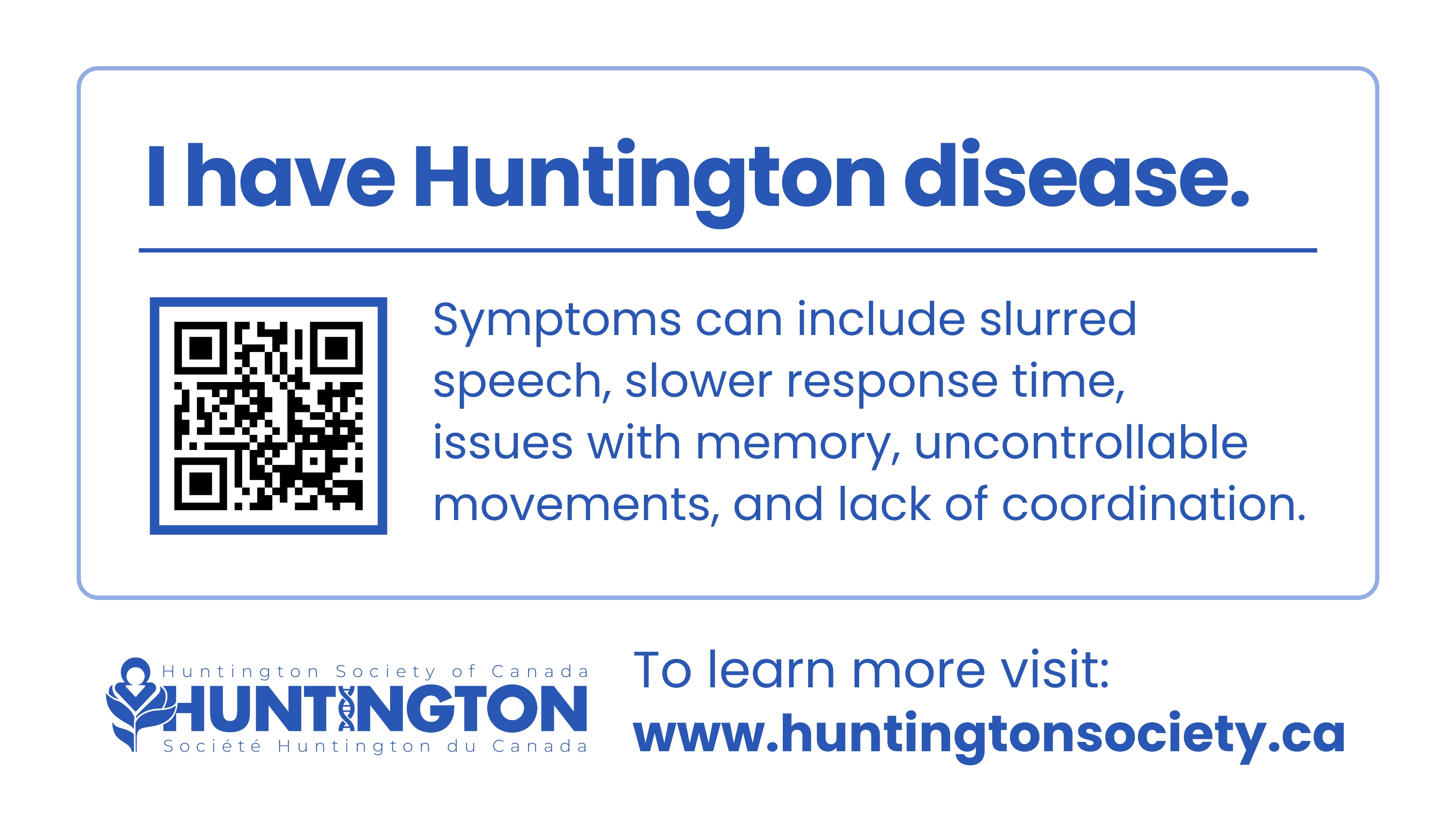 These “I have HD” cards can be used to identify that the person carrying the card is living with Huntington disease (HD). We have versions for HD and Juvenile HD.