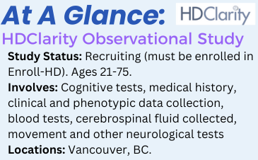 HDClarity collects cerebrospinal fluid (CSF): the liquid that surrounds the brain and spinal cord, to measure the progression of HD by measuring the biomarkers that reflect the changes inside the brain cells. This is a new international study aiming to collect samples of CSF from several types of volunteers: gene-positive people without any symptoms of HD, gene-positive people who have symptoms and people who are either gene-negative or have no family history of HD.